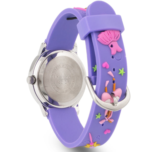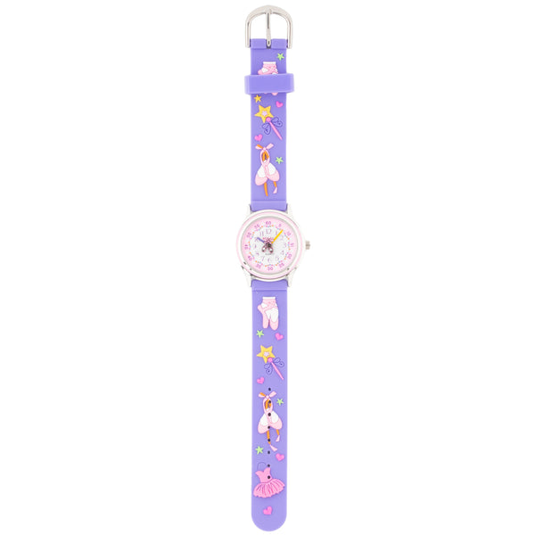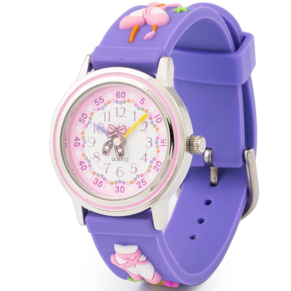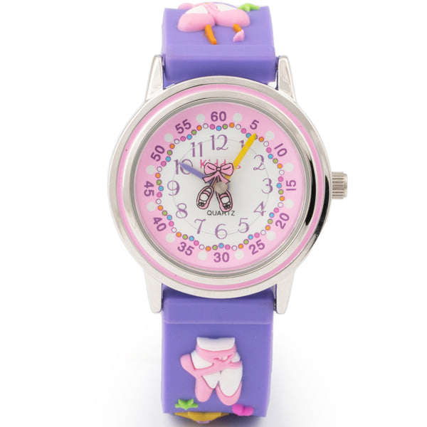 - Purple Watch with 3D ballerina shoes and dresses cartoons on the easy to clean and comfortable silicone strap.