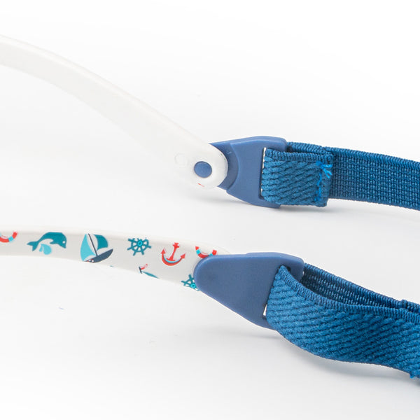 - Occhiali da sole da bambino blu scuro con gambe bianche e design nautico con ancore