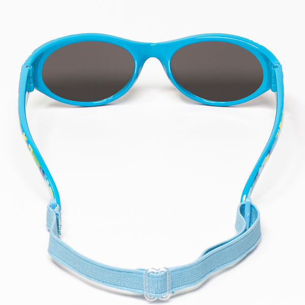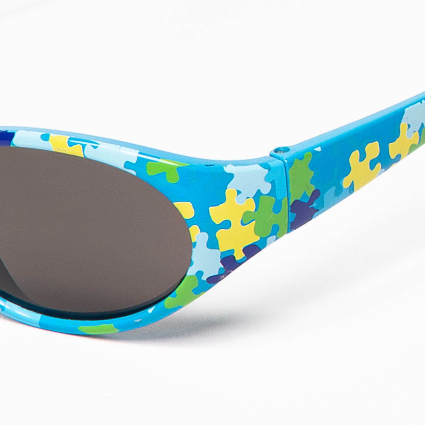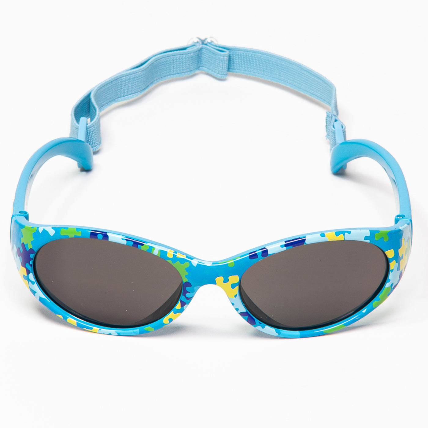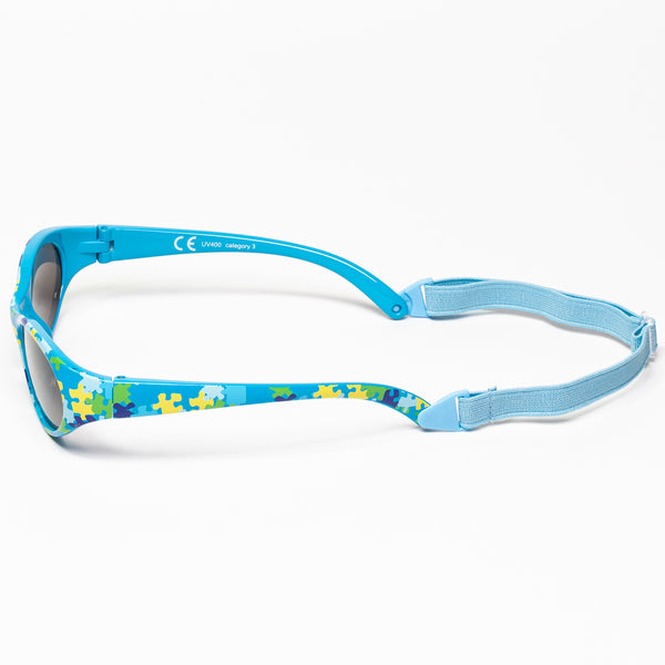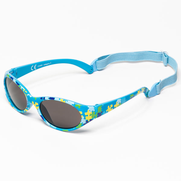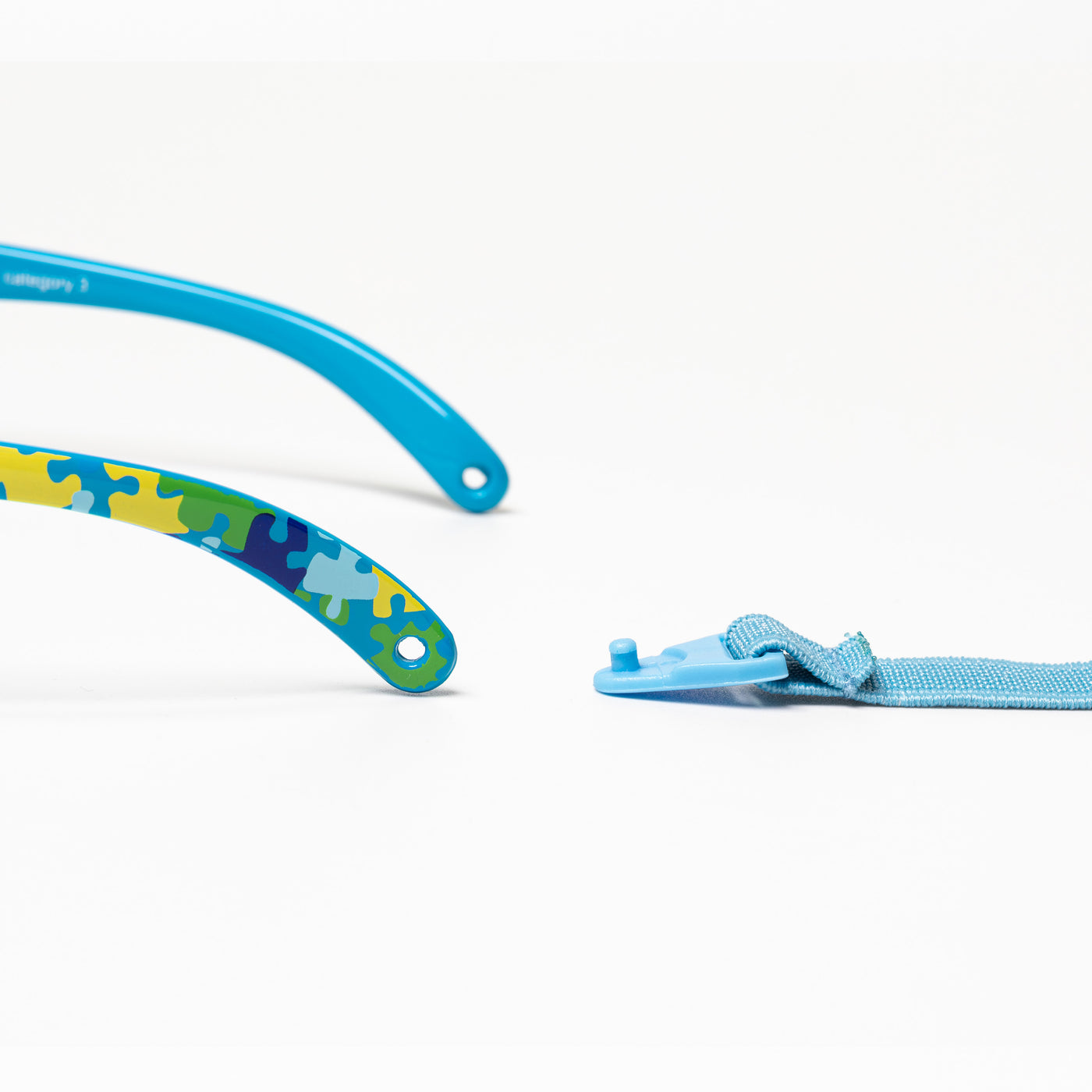 - Occhiali da sole blu da bambino con design puzzlee cinturino azzurro regolabile.
