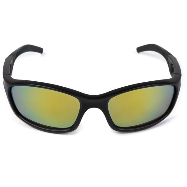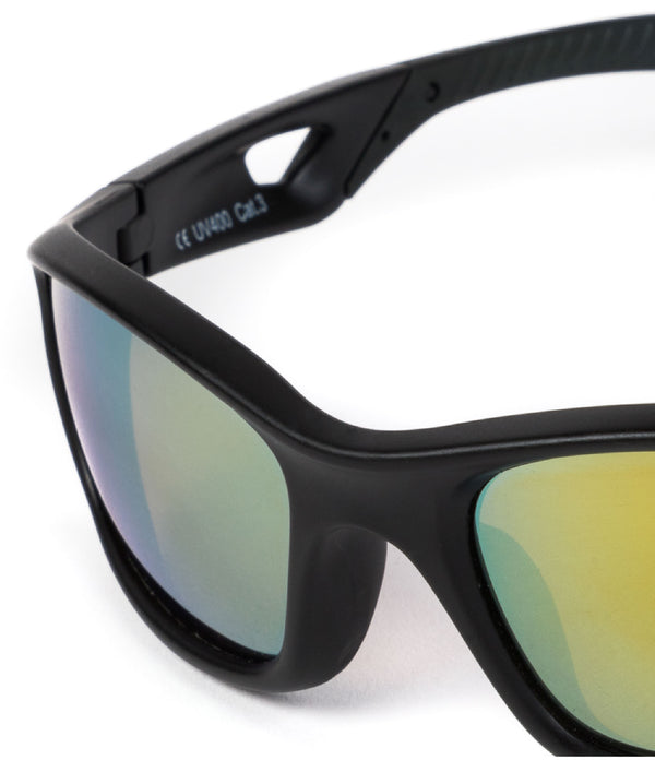 occhiali da sole. - Occhiali da sole neri con lenti gialle specchiate.